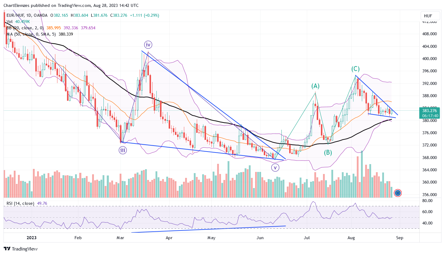 Lefelé ékelődés az 50 napos átlagra! Ebből az ékből a holnapi, keddi kamatdöntésre felfelé durranhat el.