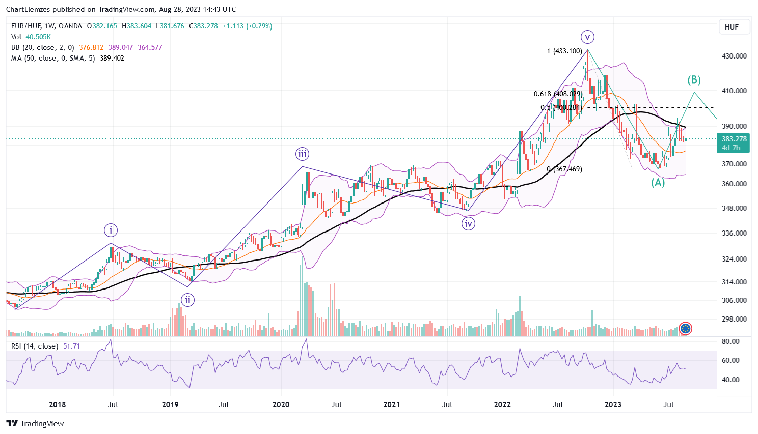 Egy szabályos Elliott ciklus. Az A pont kijelölésre került, a B hullám közepén vagyunk immár. Az 50 hetes átlag gyenge ellenállás, ha átviszi fel, ez sem áll meg 400 alatt. Legalább 410-ig várjuk.