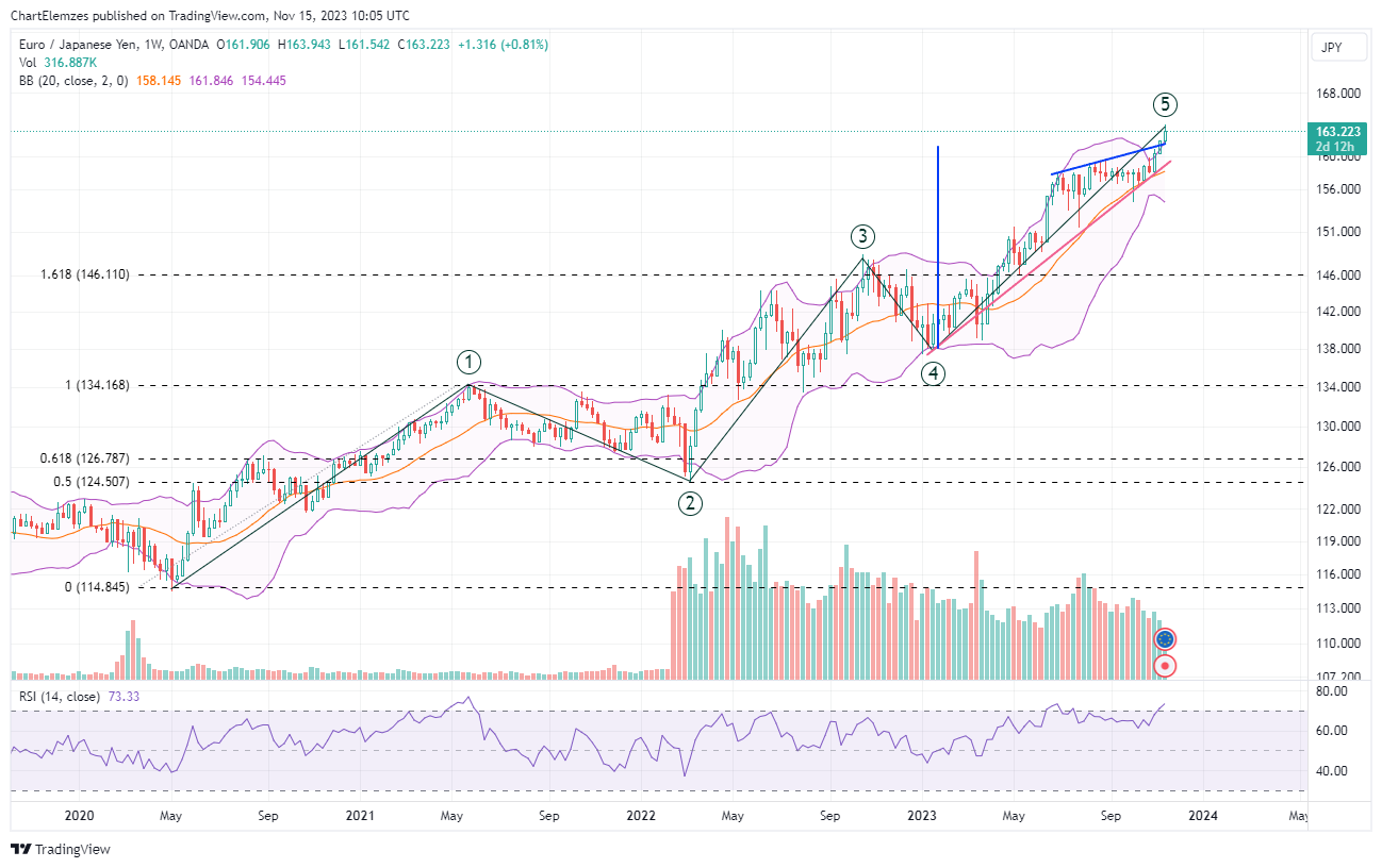 EUR/JPYHeti: [2023-11-15 11:08:35] Öt hullám felfelé heti szinten. A vége heti szinten is ékelődés. Zegnap a CPI adatra kiszúrás felfelé trendirányban. Minden időtávon túlvett extrém az RSI-je!!! (1 és 4 órás, napos, hetes, hónapos időtávon is!) Kb. az év végéig eshet 1000 pontot, 146 környékére. ![]() |