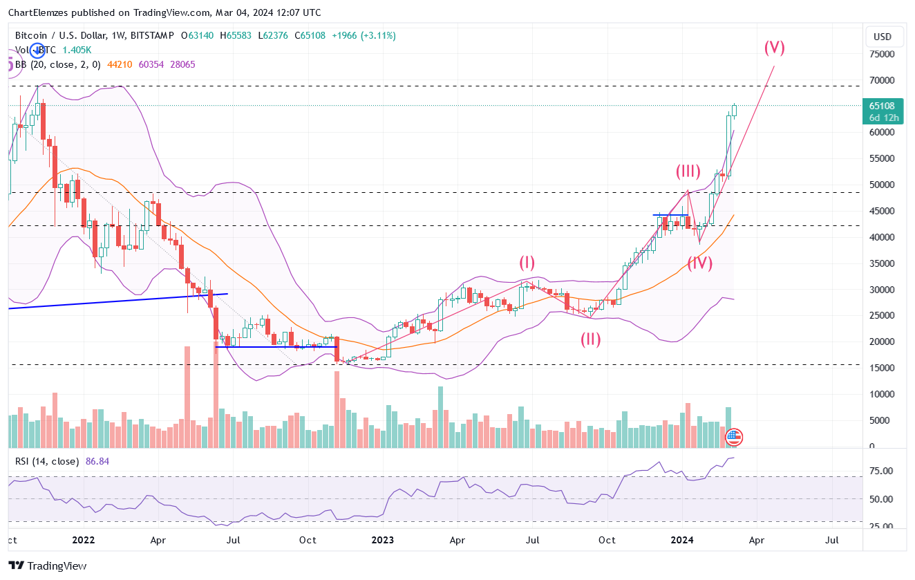 EXOTIC: Btc/UsdHeti: [2024-03-04 13:25:58] Íme, a heti chart logaritmikus skálázással. Minden impulzushullámmal duplázott, 15000-ről indulva. E szerint az 5. hullám akár 78000-ig is elviheti. Viszont rendkívül túlvett ezen az időtávon (is), teljesen kiment a Bollinger szalagok közül. Nehét lesz folytatni az emelkedést korrekció nélkül. Ám ez a korrekció bármikor átválthat a hatodik hullámba, vagyis visszaeshet 50000 alá. A kripta szekta ezernyi érvet fel tudna sorolni arra, hogy miért emelkedik – bla-bla-bla -, én viszont arra hívom fel a figyelmet, hogy ezt a ciklust egy időben kezdte a tőzsdék emelkedő ciklusával, 2022 októberében. Ez is csak addig fog emelkedni, amíg a jelenlegi tőzsdei buborékfújás tart. Megfordítva: egy itt beinduló markáns esés előrejelezheti egy markáns tőzsdei esés kezdetét! ![]() |