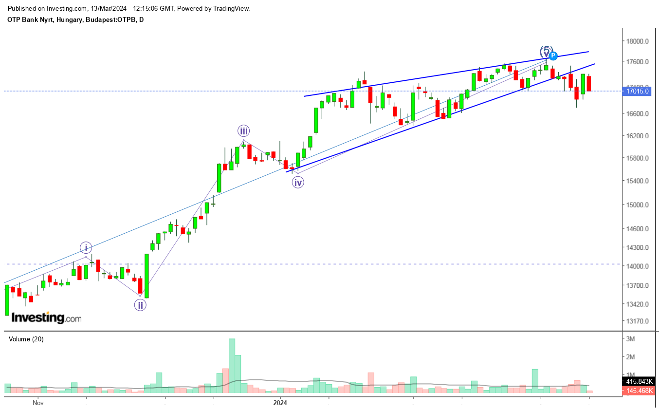 OTPNapi: [2024-03-13 14:10:11] Elliott-ciklus. Az ötödik hullám is öt hullámból áll, a vége egy ékelődés! 17500 körül az 5. pont kijelölésre került. A gyorsjelentésre elindult az esés, ahogy vártuk - az ékből letört! Tegnap visszateszt, ma a már letört ék alsó száráról újra esés. A hatodik hullámmal 14000 környékére eshet. Ha a rövidebb Elliott-ot is figyelembe vesszük, akkor köztes megálló, ill. támasz 16000 körül lehet. ![]() |