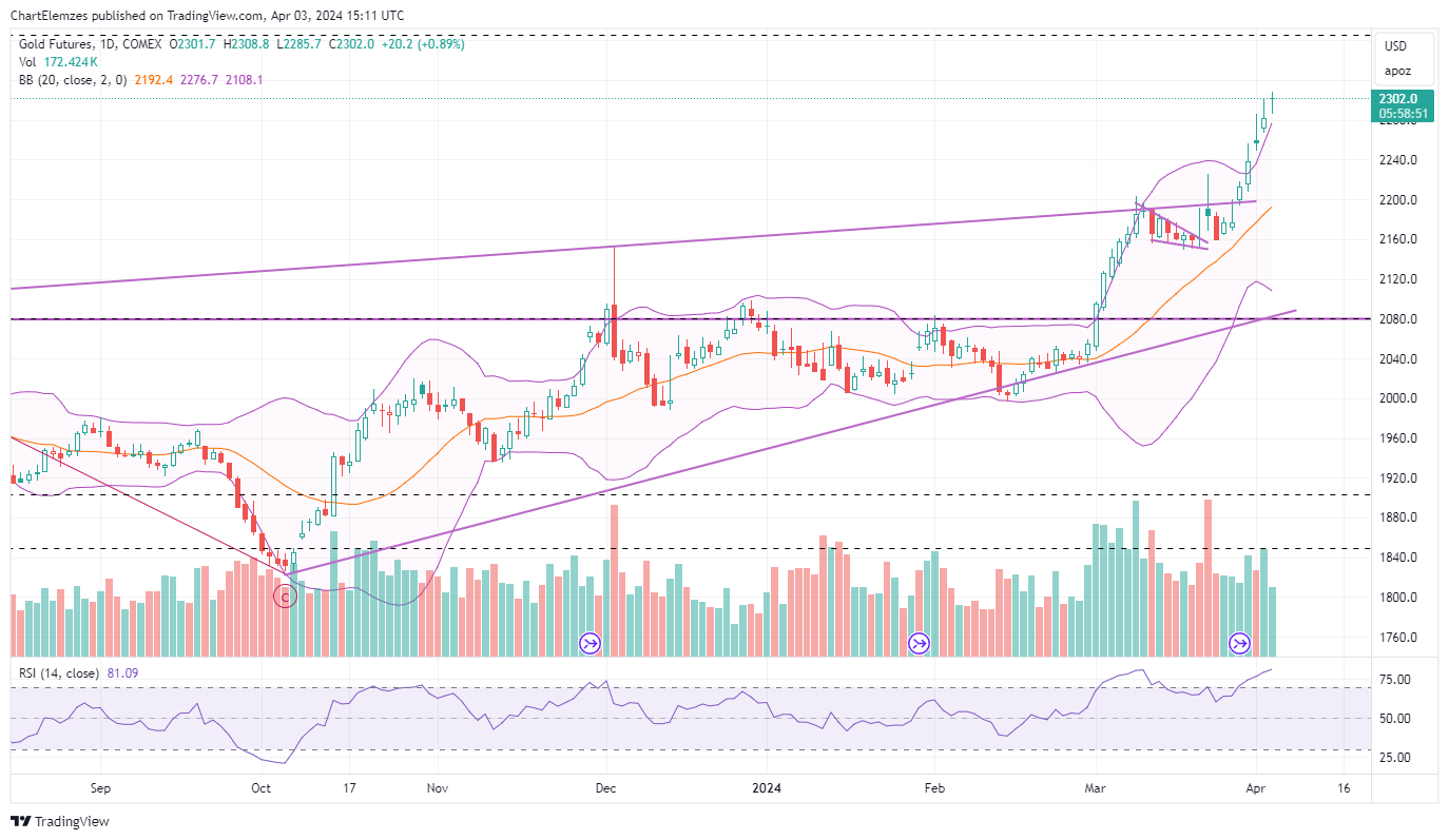 Nagy menet felfelé, teljesen a BB szalagokon kívül jár. Erősen túlvett, korrekció jöhet.