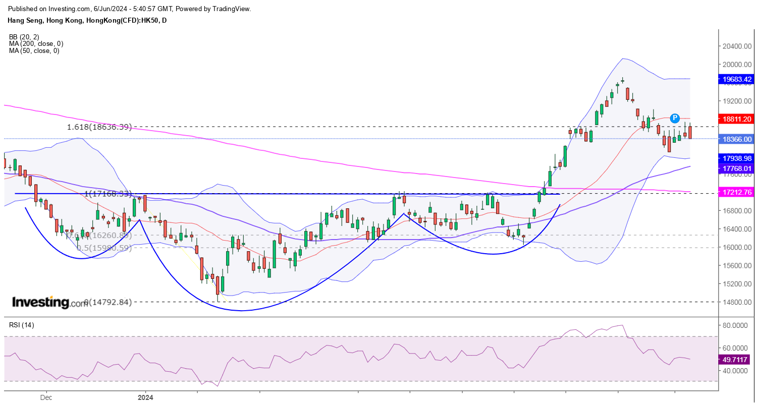 Exotic: Hang-SengNapi: [2024-06-06 08:55:48] A mai súlyos piros gyertya azt mondja, hogy a kínai piac április közepén induló egy hónapos emelkedése kifulladt, nem folytatódik, megy vissza oda, ahonnan jött. 17200-on van a támasz: a korábbi nyakvonal és a 200 napos átlag. ![]() |