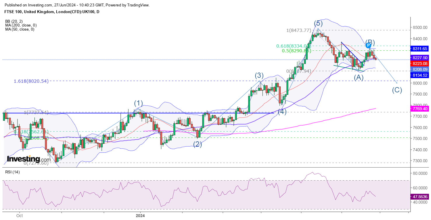 Elliott a jelölés szerint. A C hullám már elindult: három fekete hollóval le az 50 napos átlag alá. 8100 alá, 8000-ig eshet a C hullámmal.