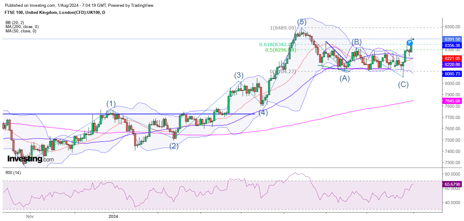FtseNapi: [2024-08-01 09:00:27] Elliott a jelölés szerint. 8000-ig esett (majdnem) a C hullámmal. Innen aztán rally indult felfelé, a fej-váll-ból való letörés behalt. Egyelőre még alacsonyabb csúcs. A választások lezajlottak, viszont érdemes lesz rá figyelni, mert ma itt is kamatdöntés, várhatóan kamatcsökkentés! ![]() |