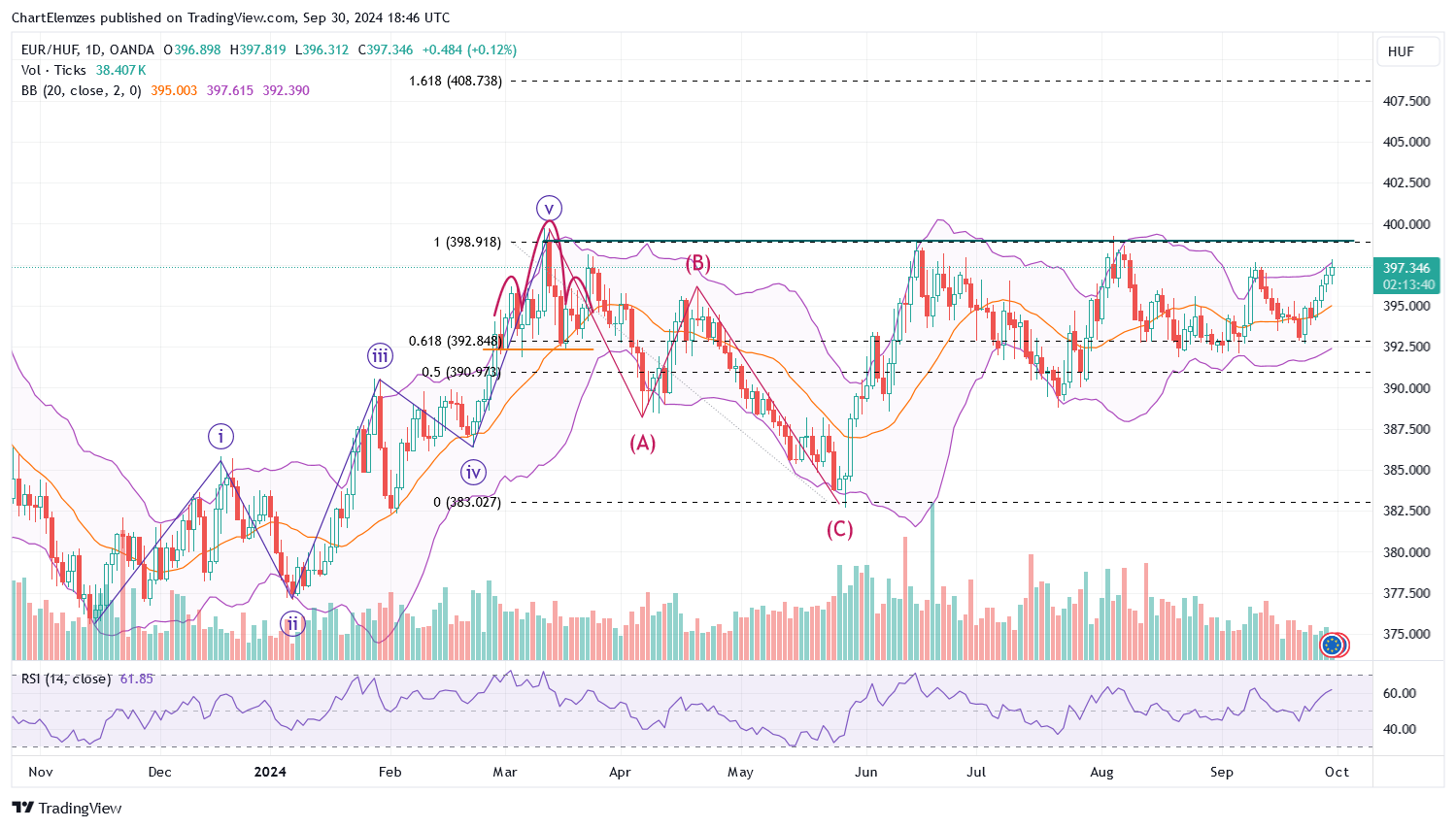 EUR/HUFNapi: [2024-10-01 09:43:17] Emelkedő háromszög, vagy ford. fej-váll. A lényeg, hogy tapad fel a 400-ra. Ha áttöri, 408-ig mehet – ezt várhatjuk. Óriási költségvetési hiány, zűrzavaros gazdaságpolitika – eléggé a gyengülés irányába mutat minden. ![]() |