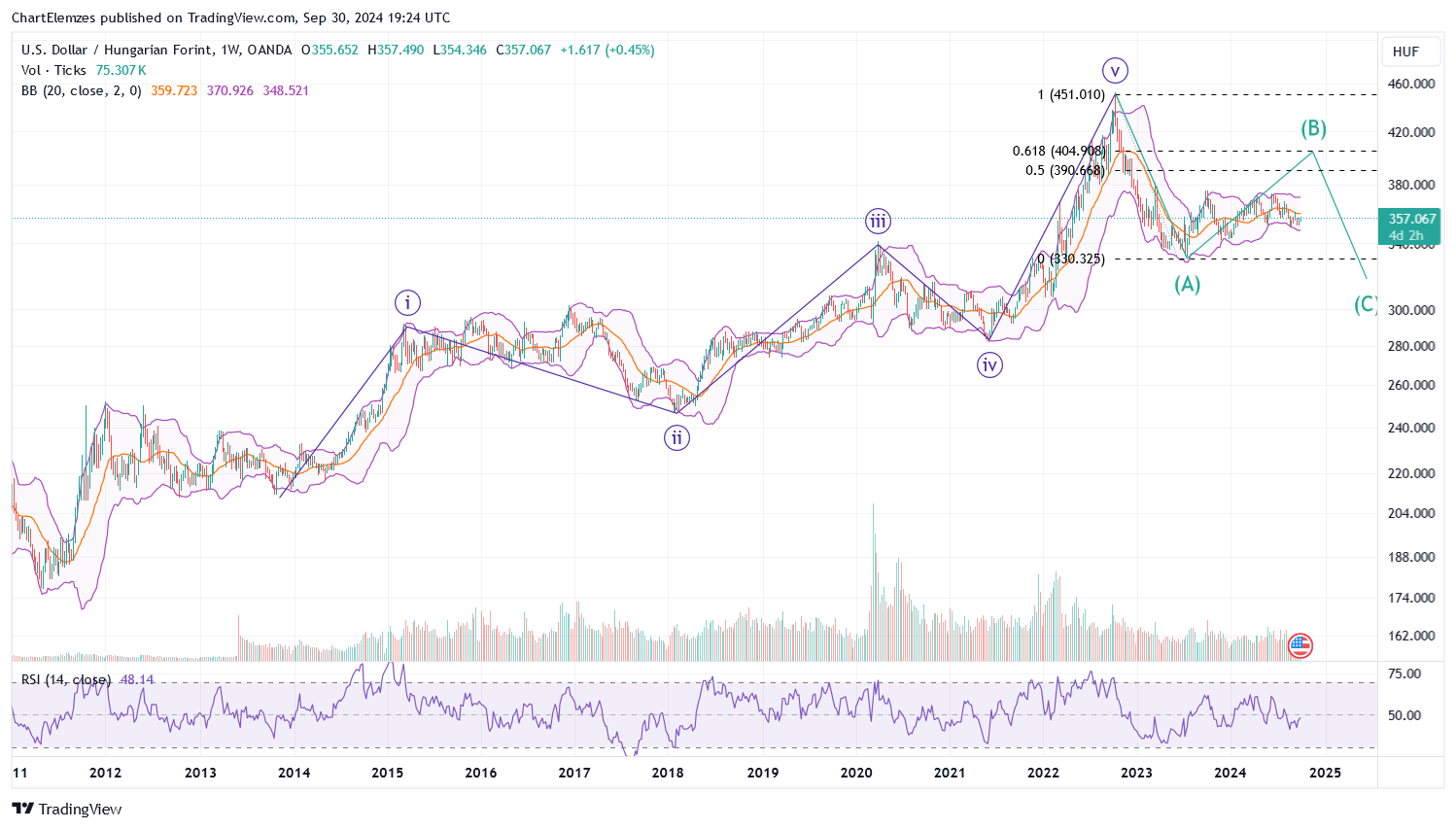 Az Elliott B hullám ezen az időtávon 400 fölé emeli.