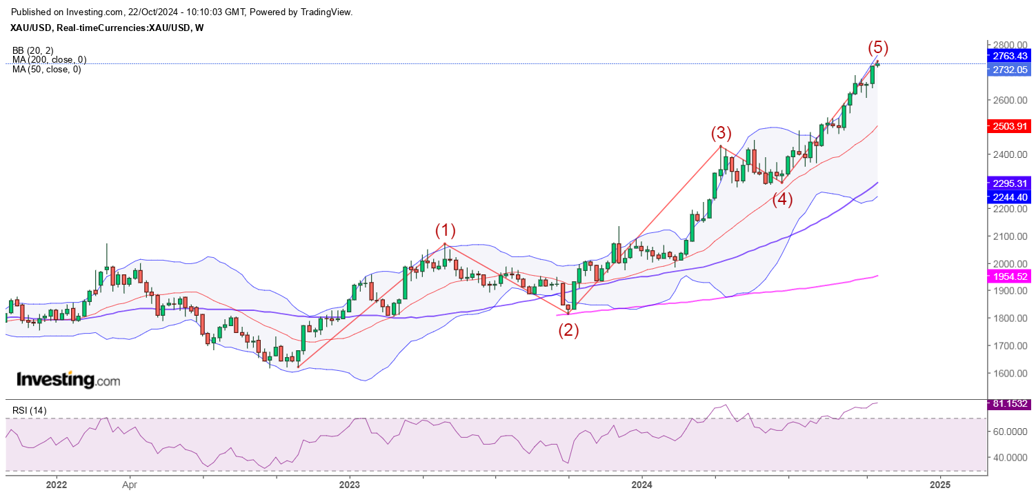 Heti szinten is egy markáns Elliott! Itt is teljesült az 5. hullám célára, és ehhez óriási túlvettség ezen az időtávon (is): 80 feletti RSI!