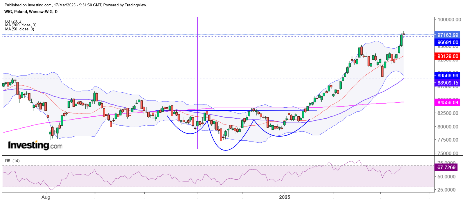 Az év elején tört ki egy ford. fej-váll alakzatból. Öt hullámban emelkedett, ha nem is teljesen szabályosan. A 100000 pontot esetleg még megérintheti, de feljebb nem látni. A lengyel index az ukrajnai béke legnagyobb nyertese lehet - elvileg.