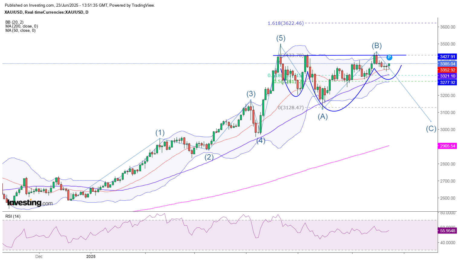 Arany (xau/usd)Napi: [2025-06-23 15:45:39] Öt hullám fel, és már két korrekciós hullámon is túl van. A C hullám indul? Itt van viszont egy nagy ford. fej-váll. Ez viszont erősen felfelé mutat. Nagy kérdés, hogy a geopolitikai turbulenciák hullámain melyik irányba indul. Eléggé túlvett, van honnan esni. ![]() |