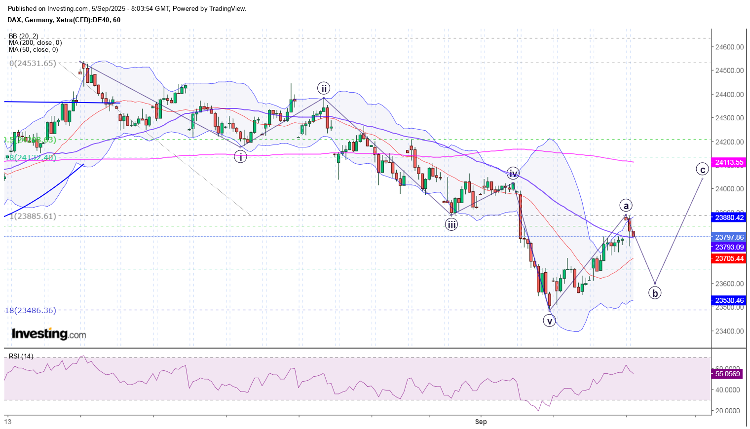 ELLIOTT. Az 5. hullám teljesült. Az A hullám teljesült, amely visszaemelte 23900 környékére. Ahogy vártuk. A B hullámmal eshet 23500-ig.