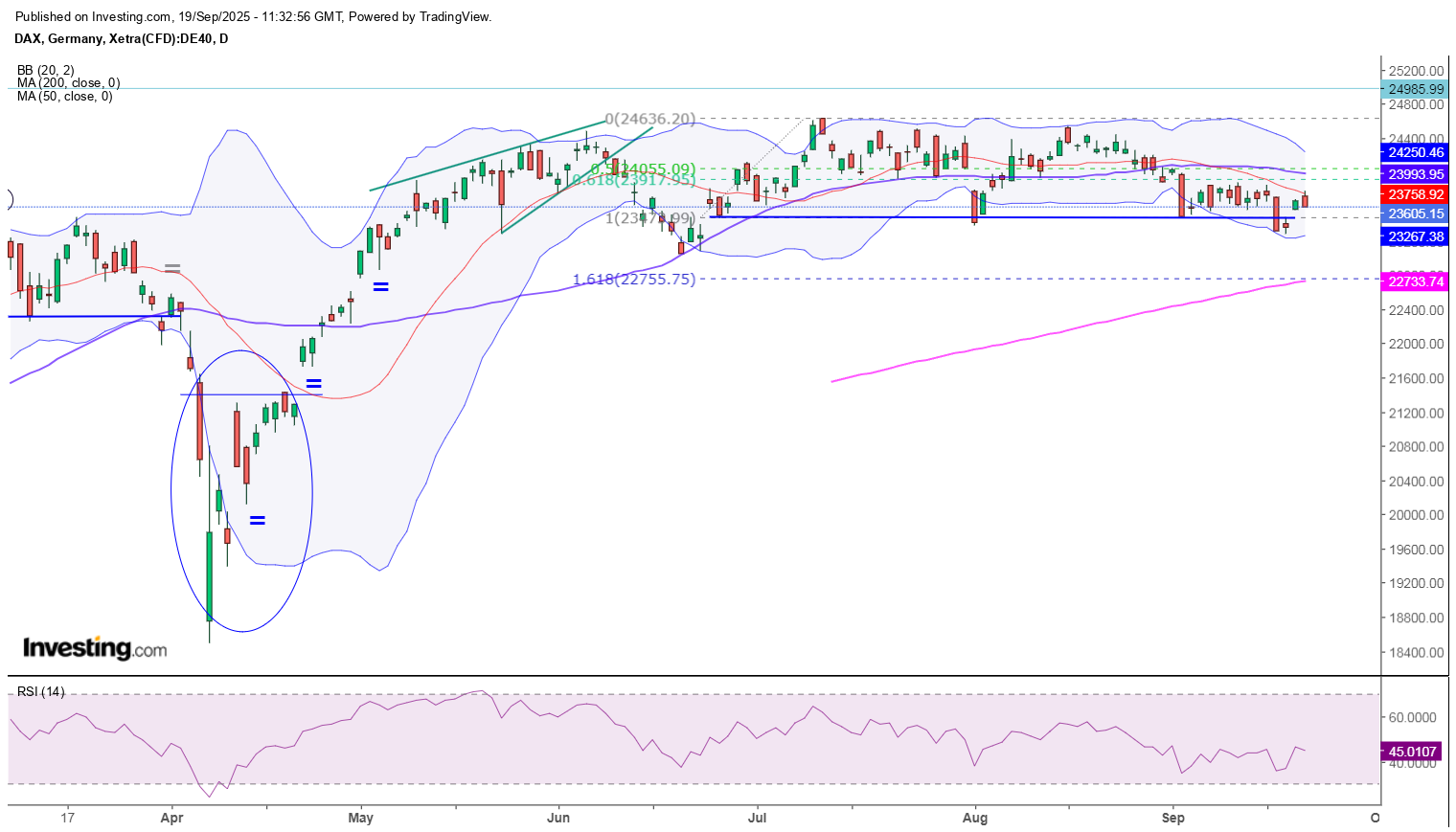 Az 50 napos átlag alatt oldalazás. Kicsit hosszabb távon duplatető, 23400-as nyakvonallal. Ebből letörhet, 22500, a 200 napos átlag és a rés a cél.
