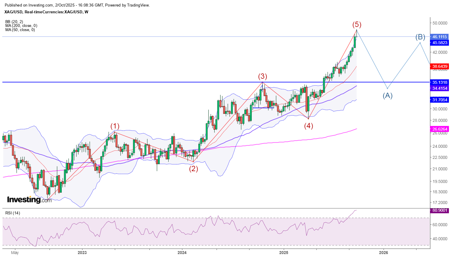 Ezüst (xag/usd)Heti: [2025-10-02 18:50:49] Az aranyhoz képest lemaradó volt, de aztán óriási lendülettel hozta be a lemaradást. Ezen a héten – pontosabban ma – aztán valami nagyon megváltozott. A teljes heti emelkedést visszaadta – ez egy doji star. Ez a doji a logaritmikus charton az 5. pontot jelölhette ki. Éles hegymenet után hasonlóan éles esés következhet, 35 alá. Ez az esés figyelmeztető jelzés lehet a teljes piacra vonatkozóan. Nem kizárt, hogy ez már a tőzsdei trendforduló első jele! Tőkeáttételes arany. :) ![]() |