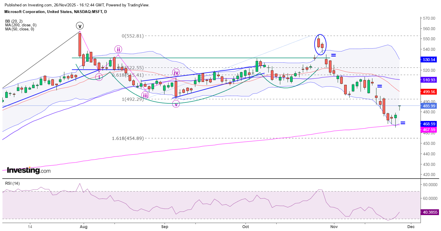 MSFTNapi: [2025-11-26 18:13:52] A rések alapján számított célárat elérte, bár kimerülési rés nem keletkezett. A 200 napos egyébként is támasz volt, erről pattant fel. A (szökési) rés visszatölthető 500 körül. Van egy másik, kevésbé optimista verzió is. Ha oldalazásba kezd, akkor ez egy Elliott negyedik hullám, és az ötödikkel letörheti a 200 napost, és 450 környékére eshet. ![]() |